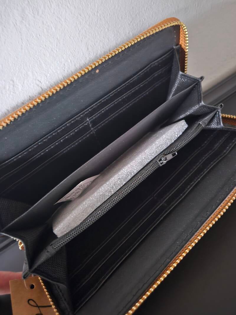 Binnenin is er ruimte voor briefgeld, vakjes voor pasjes en een plek voor muntgeld. Deze portemonnee is zowel functioneel als stijlvol.